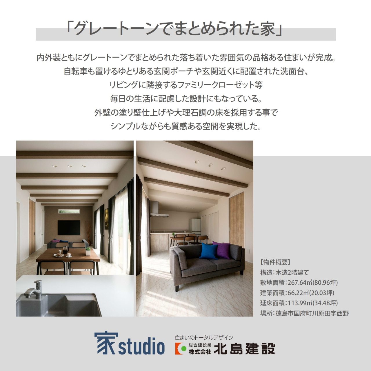 木造2階建てで内外装ともにグレートーンでまとめられた落ち着いた雰囲気の品格ある住まいが完成。