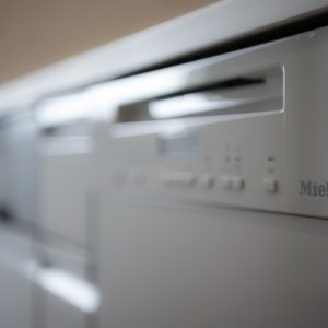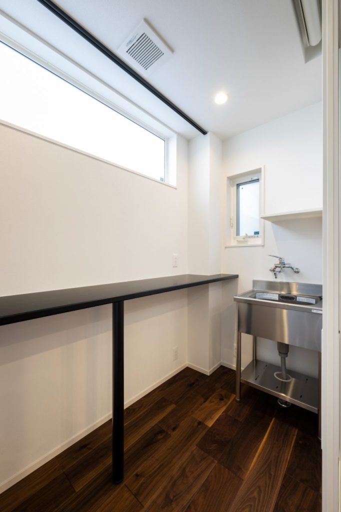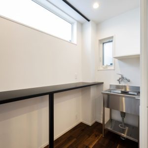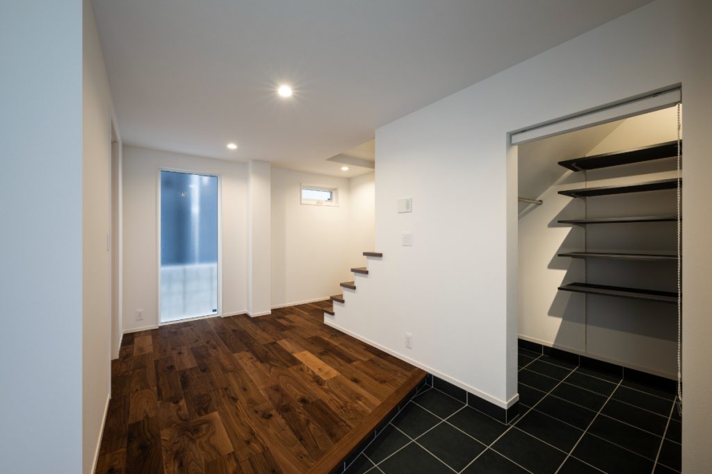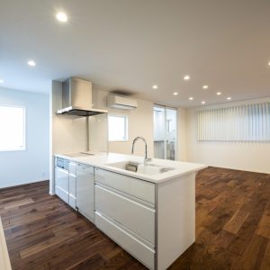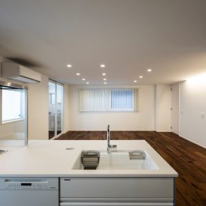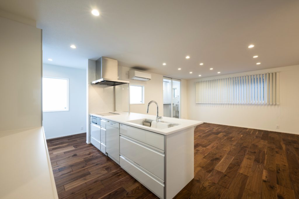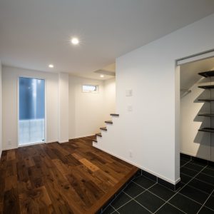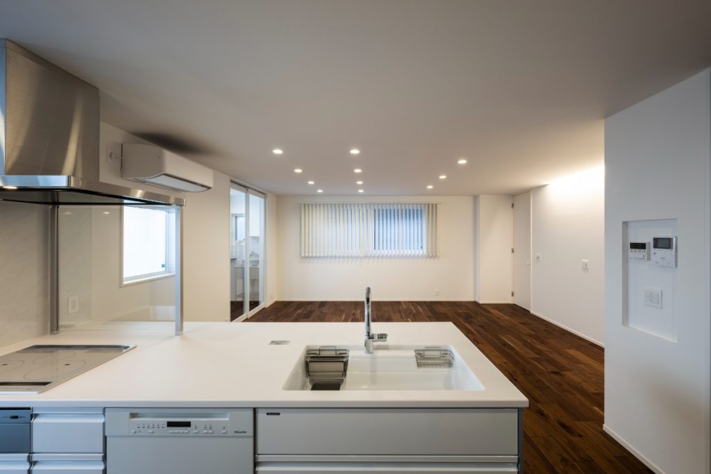 玄関は間口3mの広さに大容量SCLを併設。ビルトインガレージや外部物置も設け、都市の暮らしに必要な機能を凝縮。室内はウォルナットの床にホワイトのキッチンを合わせ、落ち着いた上質空間に。W2750キッチンにはドイツ製食洗器Miele(ミーレ)を採用しました。