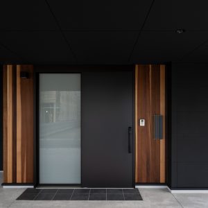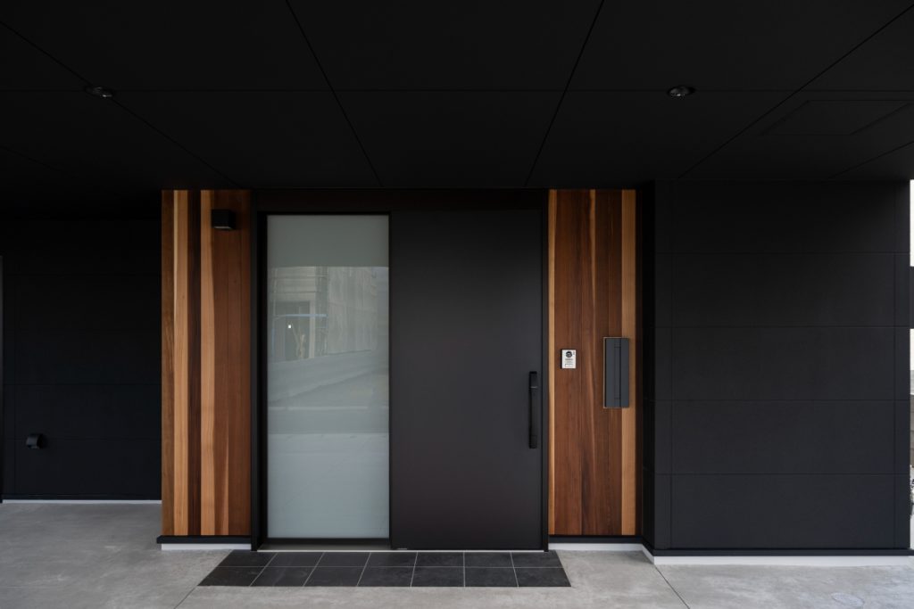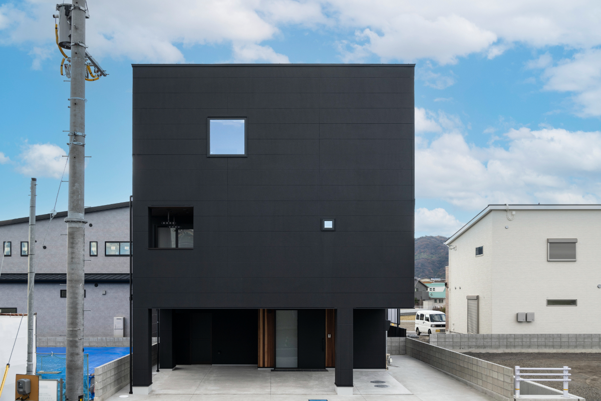 40坪の敷地に延床55坪を実現した、鉄骨造3階建ての邸宅。立体的に空間を積み上げ、収納力・快適性・デザイン性をバランスよく備えました。外観はブラックの外壁に玄関周りのレッドシダーがアクセント。多彩なバルコニーが立体感と開放感を演出します。